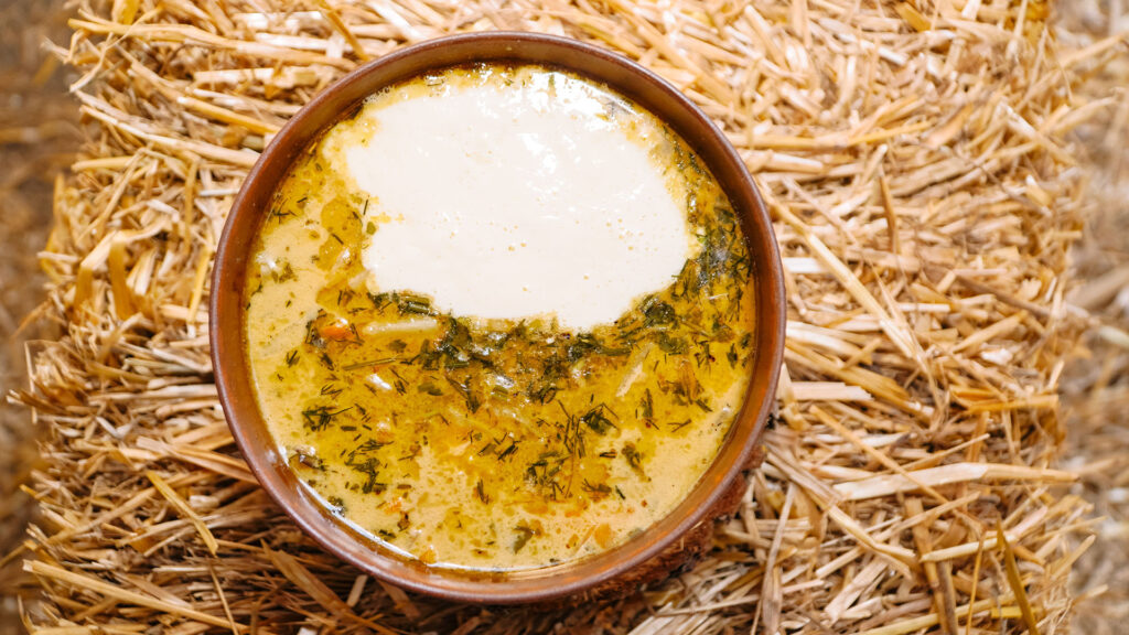 Родзинка цього борщу полягає у тому, що готують його без буряка. При цьому він має ніжний вершковий смак і аромат копченостей.