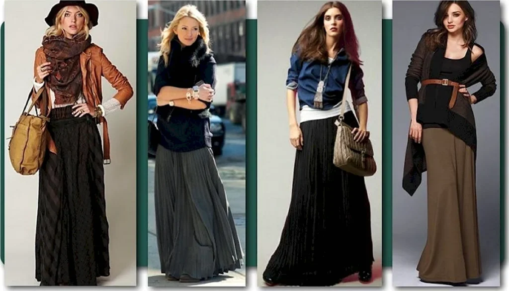 Класичні кольори – чорний, сірий, бежевий – легко поєднуються з довгими спідницями восени. Щільні тканини, як шерсть або трикотаж, тримають форму і роблять образ більш охайним.