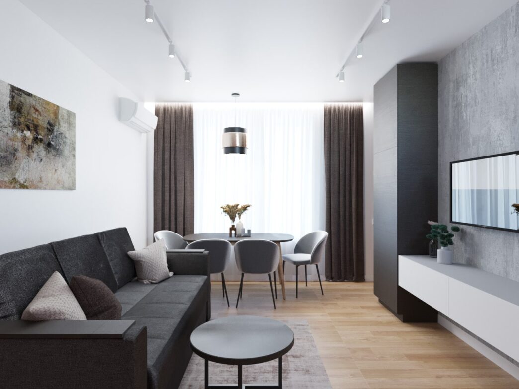 Для зонування використовуйте візуальні межі: світло, підлогове покриття, меблі різних стилів. У невеликих кімнатах світлі кольори та вертикальні елементи візуально збільшують простір.
